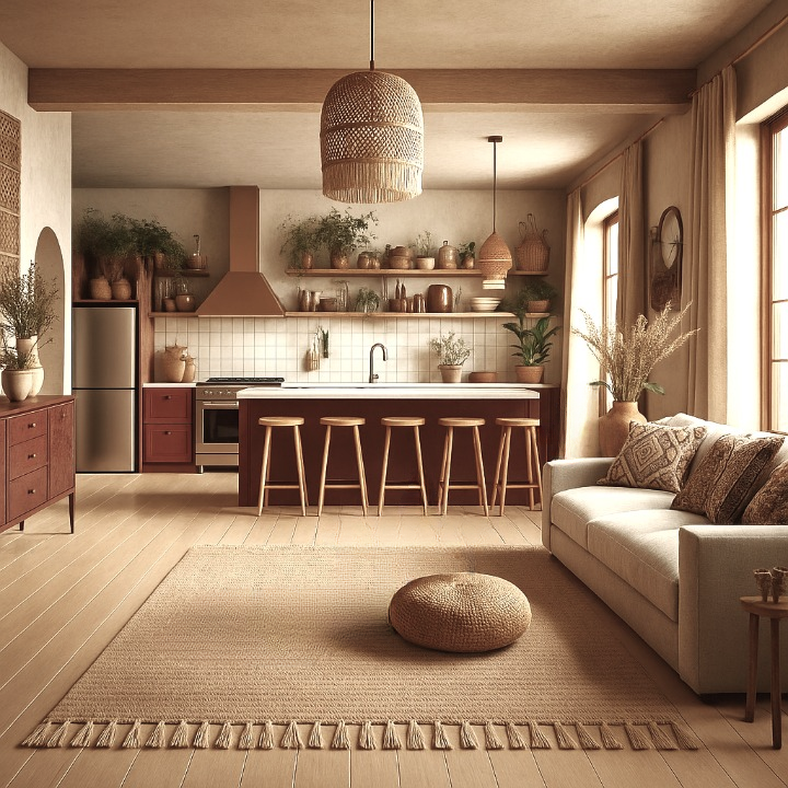 Jasne zasłony, duże grafiki o roślinnym motywie oraz dekoracje z naturalnych materiałów (jak ceramika i szkło) wprowadzają do wnętrza lekkość i przytulność. Drewniana podłoga ułożona w klasyczną jodełkę dopełnia całość, dodając wnętrzu naturalnej elegancji.