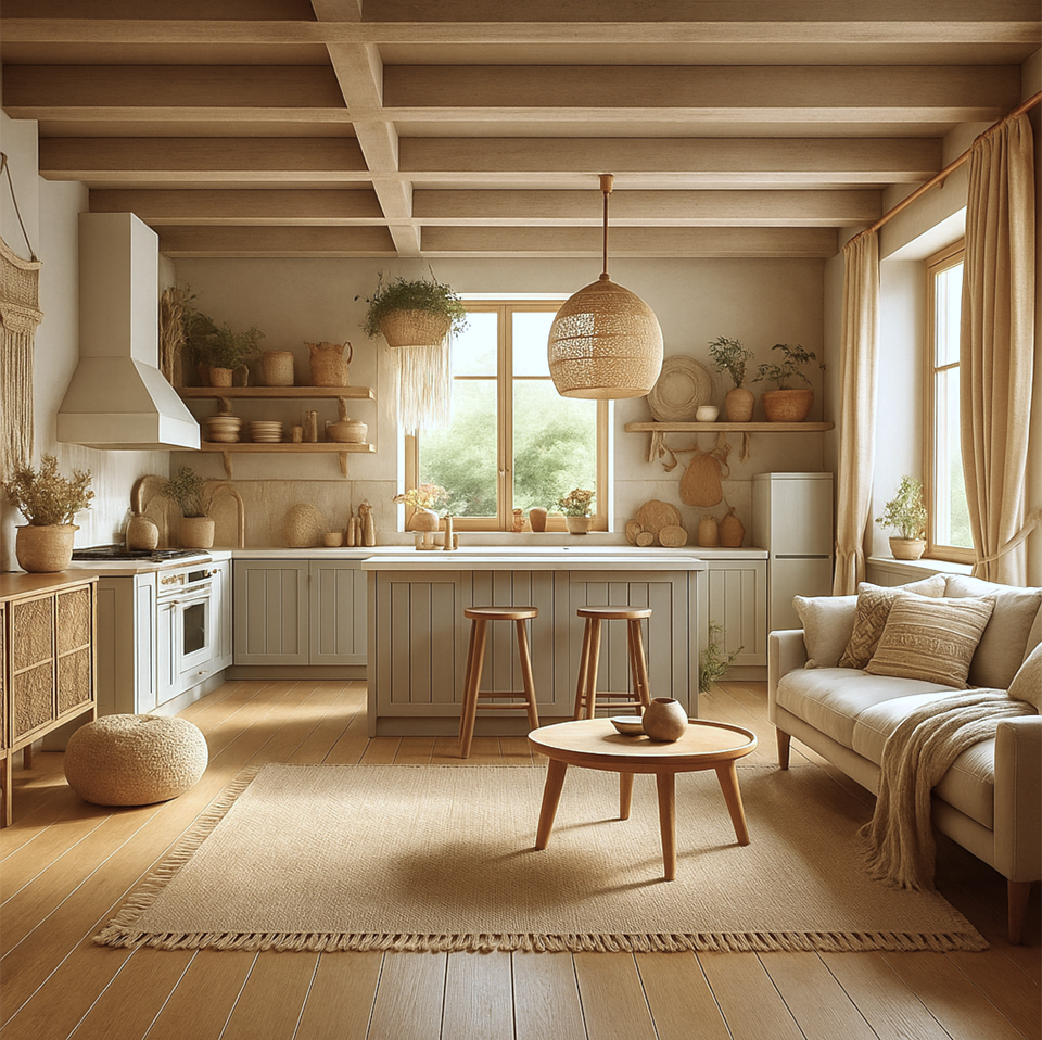 Jasne zasłony, duże grafiki o roślinnym motywie oraz dekoracje z naturalnych materiałów (jak ceramika i szkło) wprowadzają do wnętrza lekkość i przytulność. Drewniana podłoga ułożona w klasyczną jodełkę dopełnia całość, dodając wnętrzu naturalnej elegancji.