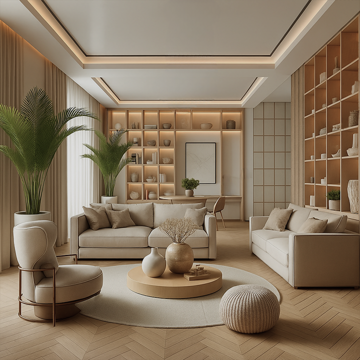 Prezentowane wnętrze salonu to połączenie nowoczesnego minimalizmu z ciepłem stylu boho i skandynawskiej prostoty. Dominujące barwy – beże, biel oraz jasne drewno – tworzą spokojną i przytulną atmosferę sprzyjającą relaksowi.