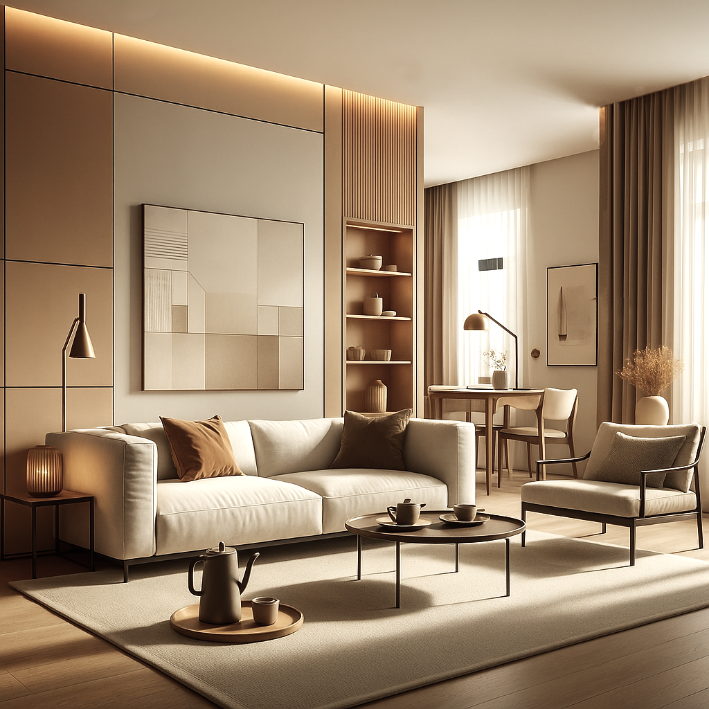 Salon zaaranżowano wokół komfortowej, jasnej sofy ozdobionej poduszkami w ciepłych odcieniach beżu, karmelu i delikatnej zieleni, które wprowadzają do przestrzeni miękkość i przytulność. Przed sofą ustawiono dwa lekkie stoliki kawowe z okrągłymi blatami i drewnianymi nogami, a całość uzupełnia elegancki, pleciony dywan w jasnym kolorze z dekoracyjnymi frędzlami.