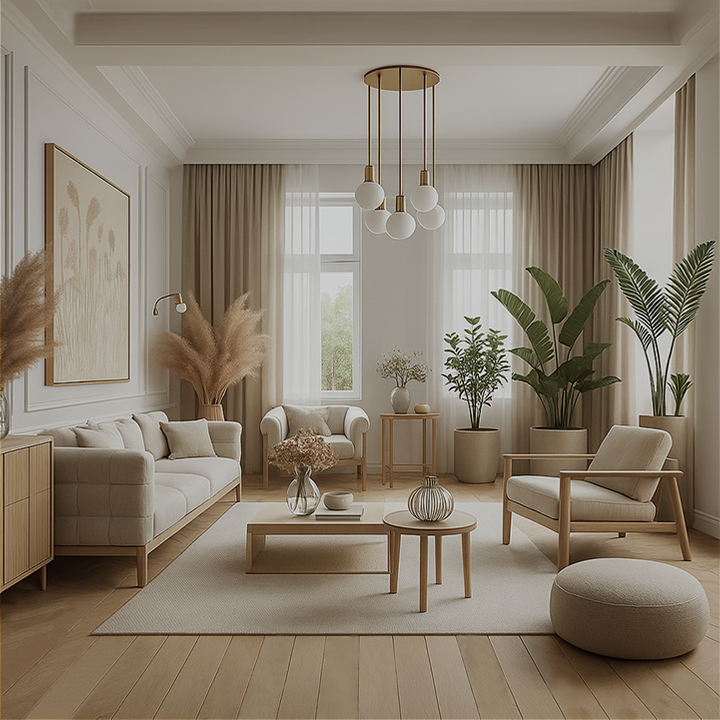 Wnętrze salonu to wyrafinowana interpretacja nowoczesnego stylu, w której dominują ciepłe beże, karmelowe akcenty i szlachetne materiały. Główna strefa wypoczynkowa została zaaranżowana wokół obszernej, modułowej sofy o miękkiej linii i neutralnej kolorystyce, uzupełnionej o aksamitne poduszki i stylowe pufy.