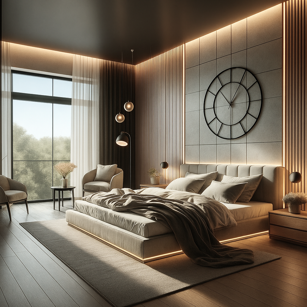 Minimalistyczna sypialnia inspirowana stylem japońskim emanuje spokojem, harmonią i naturalnością. Całość utrzymana jest w ciepłych odcieniach beżu, piasku i naturalnego drewna, co wprowadza do wnętrza atmosferę wyciszenia i głębokiej równowagi.