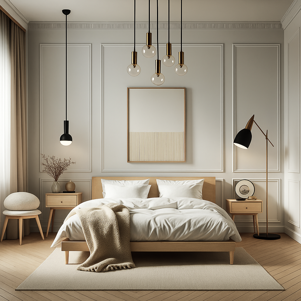Przytulna i kreatywna sypialnia łączy w sobie nowoczesny minimalizm z artystycznym Elegancka i nowoczesna sypialnia zachwyca harmonią kolorów oraz dbałością o każdy detal. Dominują w niej ciepłe odcienie beżu, jasnego drewna i subtelnych szarości, które wprowadzają przytulną, kojącą atmosferę.