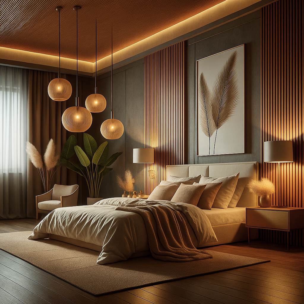 Przytulna i funkcjonalna przestrzeń łączy w sobie komfort sypialni z wygodą domowego biura. Wnętrze utrzymane jest w ciepłej, naturalnej palecie barw — dominują odcienie szarości, beżu i drewna, które tworzą harmonijną i sprzyjającą relaksowi atmosferę.