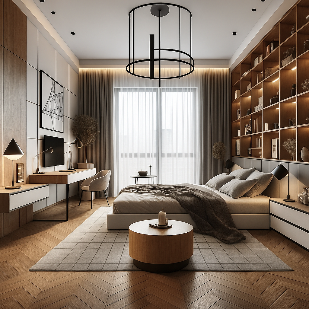 Całość tworzy harmonijną, spokojną atmosferę idealną do odpoczynku, łącząc naturalne materiały i stonowaną paletę kolorystyczną w nowoczesnym wydaniu.