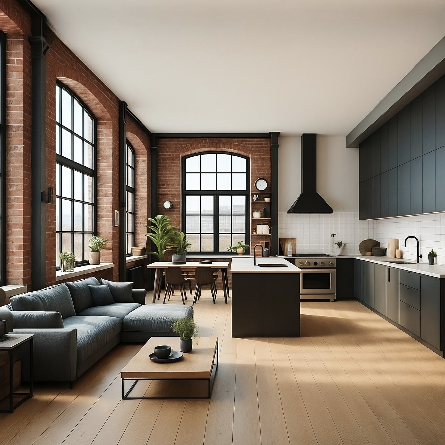 Część jadalniana to duży, jasny stół otoczony tapicerowanymi krzesłami o miękkich kształtach. Całość oświetlają trzy złote, nowoczesne lampy wiszące, które subtelnie podkreślają elegancję i intymny charakter tej strefy.
