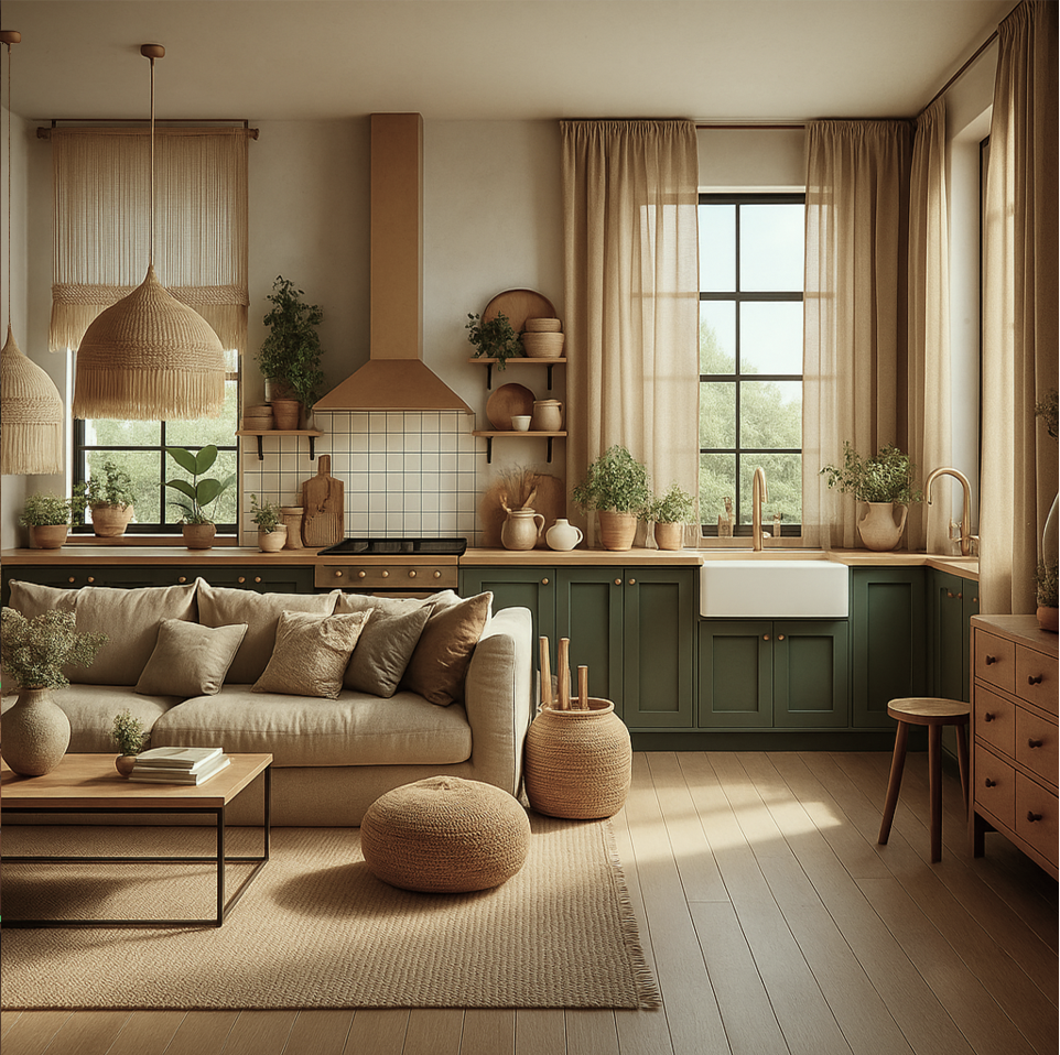 Wnętrze łączy naturalność stylu rustykalnego z lekkością i swobodą estetyki boho, tworząc ciepłą, zapraszającą przestrzeń idealną do odpoczynku. Salon i kuchnia harmonijnie przenikają się, zachowując spójność w kolorystyce i materiałach.