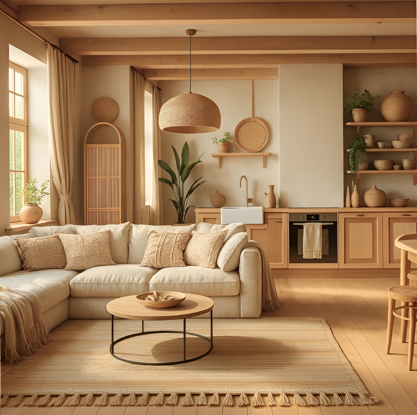 Wnętrze emanuje spokojem, przytulnością i naturalnym urokiem, łącząc elementy stylu boho z rustykalną prostotą. Otwarta przestrzeń salonu i kuchni tworzy harmonijną, funkcjonalną całość, idealną do codziennego wypoczynku.