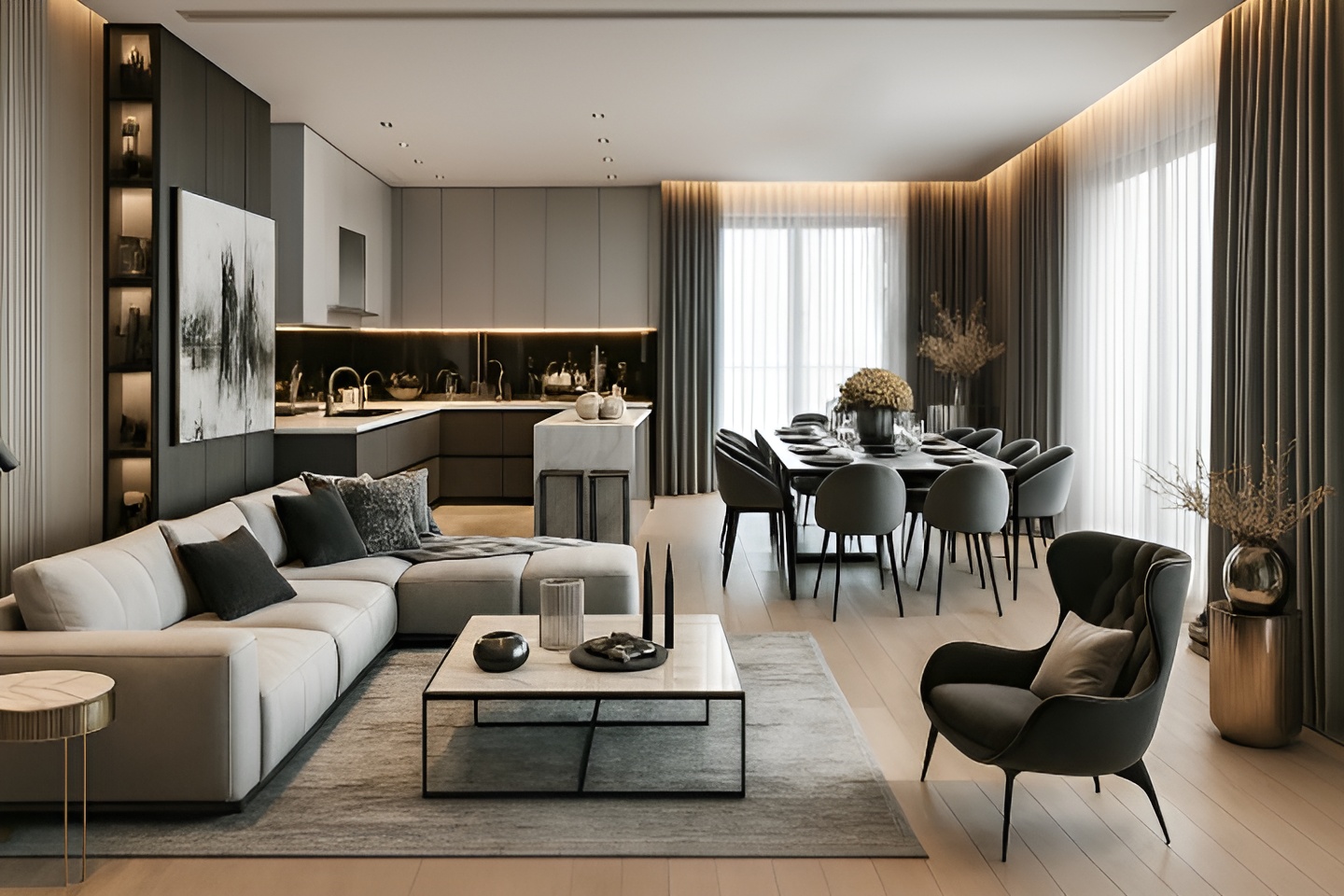 To wnętrze zachwyca świeżością, subtelnością i luksusowym minimalizmem. Przestrzeń salonu, jadalni i kuchni została harmonijnie połączona, tworząc jasne, przestronne i spójne stylistycznie wnętrze.